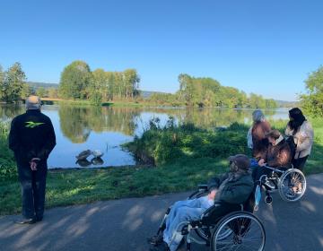 Les séances proposent des activités accessibles : lancers de balle, jeux de cache-cache, distribution de croquettes, ordres simples donnés à la chienne (assis,…